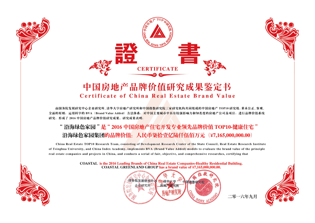 2016年9月6日,在國務院發展研究中心企業研究所、清華大學房地產研究所、中國指數研究院主辦、中國房地產TOP10研究組于北京雁棲湖國際會議中心承辦的“2016中國房地產品牌價值研究成果發布會暨第十三屆中國房地產品牌發展高峰論壇”上,沿海綠色家園集團(以下簡稱沿海集團)憑借其清晰的品牌定位、企業經營穩健性、及在健康住宅細分市場的領先優勢,連續13年榮登“中國房地產公司品牌價值top10”榜單,并榮獲“2016年中國房地產專業領先品牌價值top10-——健康住宅”獎項,其品牌價值較2015年增長12%至71.65億元。